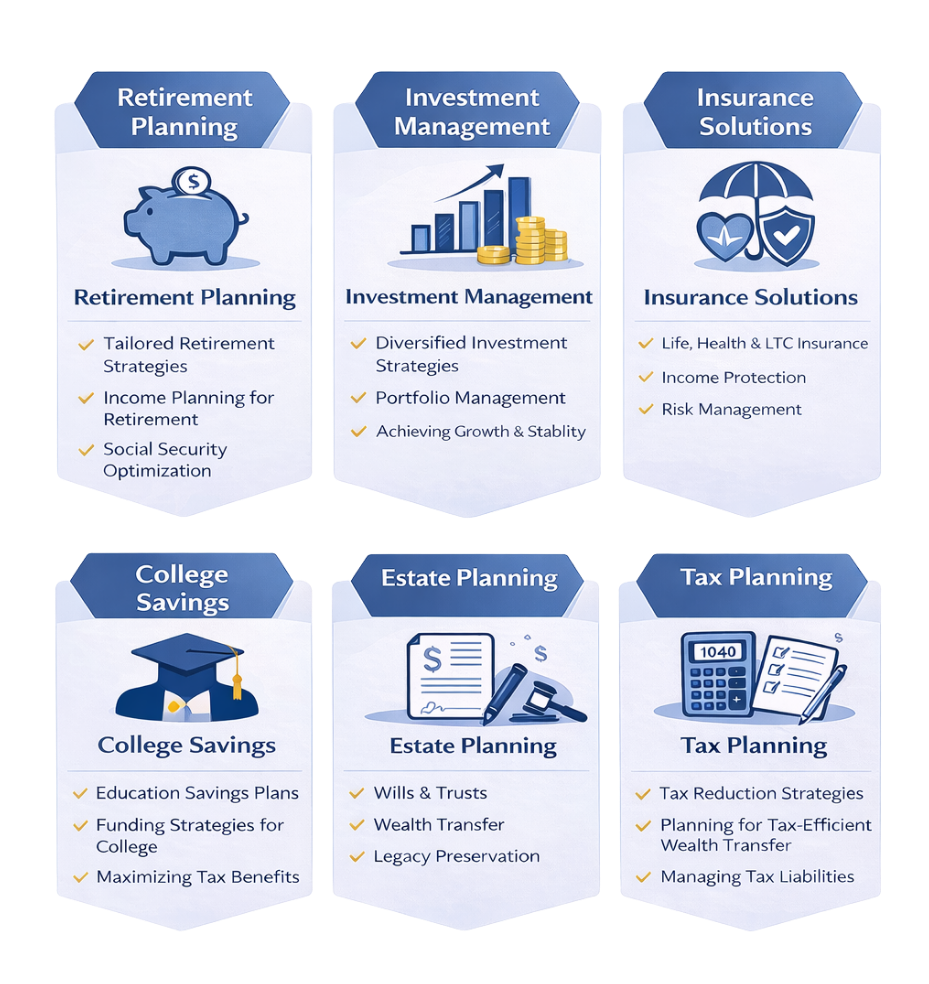 We take a holistic view of your financial life, considering your goals, values, and family priorities—not just your investments. From retirement planning and risk management to legacy strategies, we create solutions that evolve with your life.